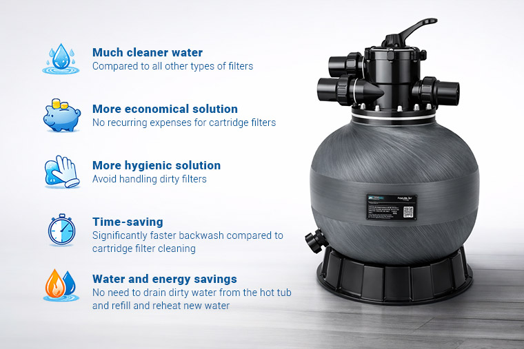 Sand filtration is a dedicated unit placed near the hot tub or in a utility room. Although the initial cost is higher than basic systems, it is compensated over time through lower operating expenses, better hygiene, and minimal upkeep.