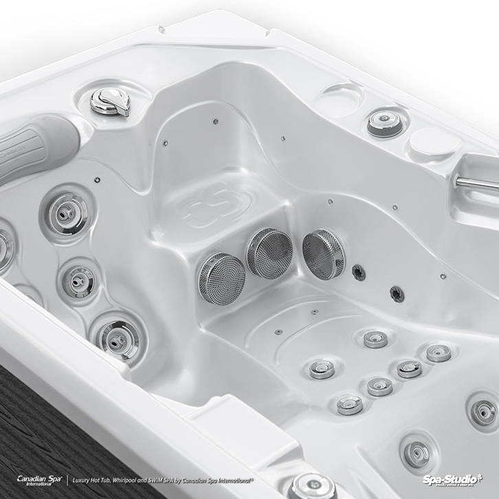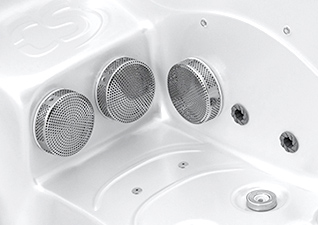 The audio system is equipped with two retractable speakers hidden inside the hot tub structure.